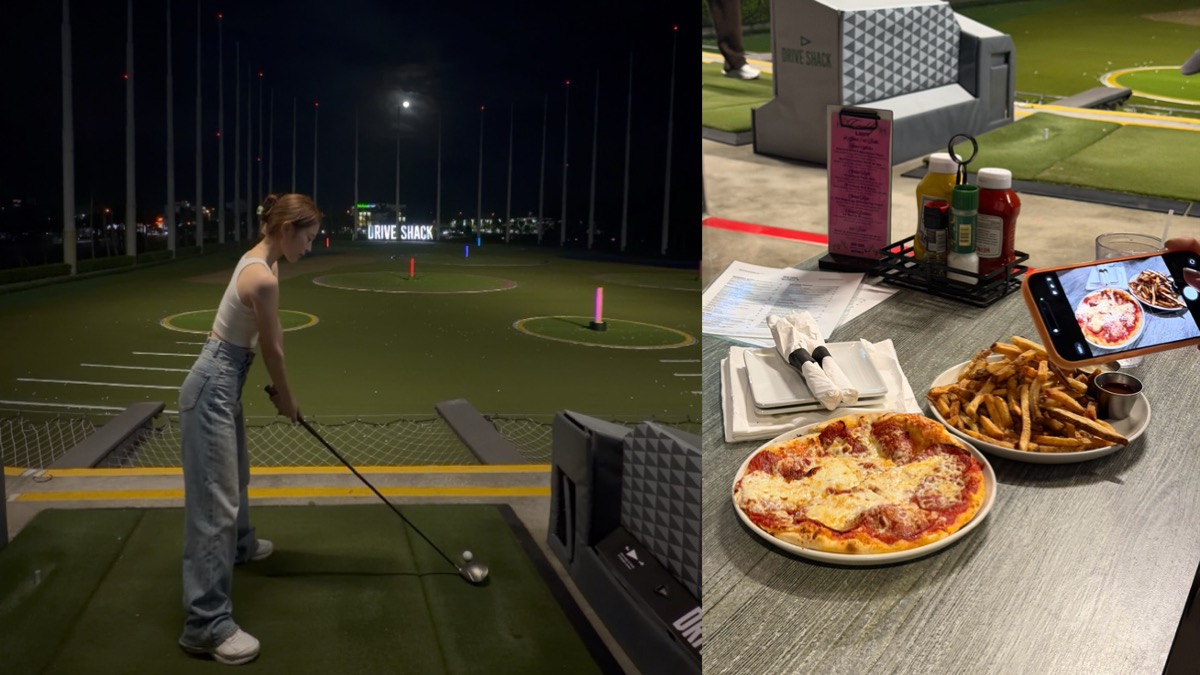 夜の時間には近くの練習場にも足を運んだ。「Drive Shack」は、いわゆるトップゴルフのようなスタイルで、音楽が流れる中、ゲーム感覚でショット練習が楽しめる施設。食事やドリンクを楽しみながら、自然とゴルフに触れられる空間になっている。