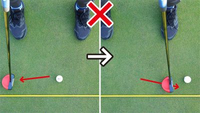 ストレートの意識が強すぎる人は、お腹を動かさないで手だけで真っすぐ振ろうとします。グリップエンドがカラダから離れてストローク軌道のブレを引き起こす要因となります。特に1~2メートルくらいのパットでは、お腹の小さい回転を使って軽いイン・トゥ・インの軌道で振ることが大事です。それこそがパットにおける「正しい真っすぐ」なのです。