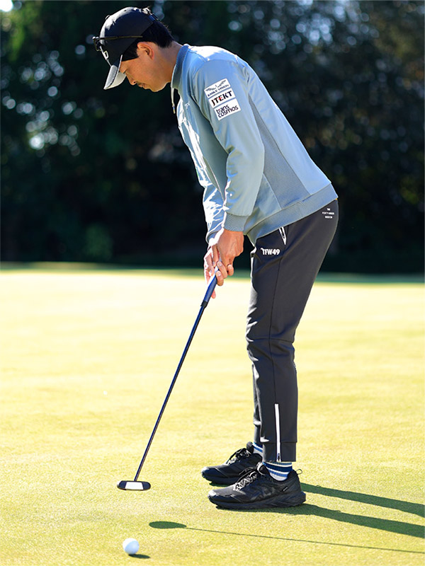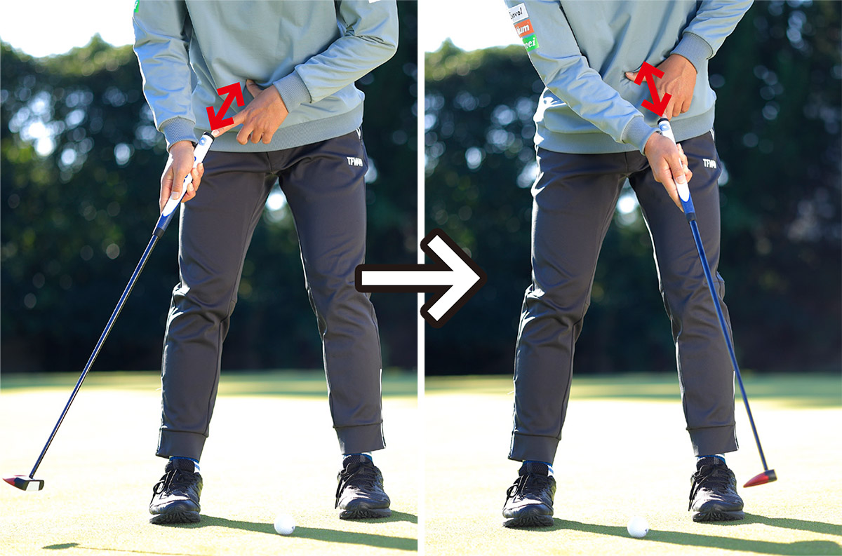 そこで意識していただきたいのは、アドレス時のグリップエンドとお腹の間隔を変えずにストロークすること。腕や手を使わず、お腹の小さい回転と連動してパターを振ればテークバックではパターヘッドがややインサイド方向に上がり、インパクト以降もややインサイド方向に振り抜かれるはずです。