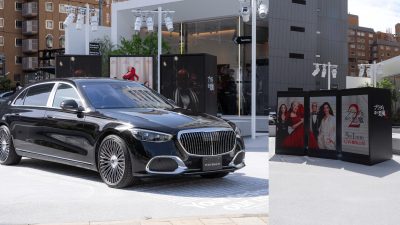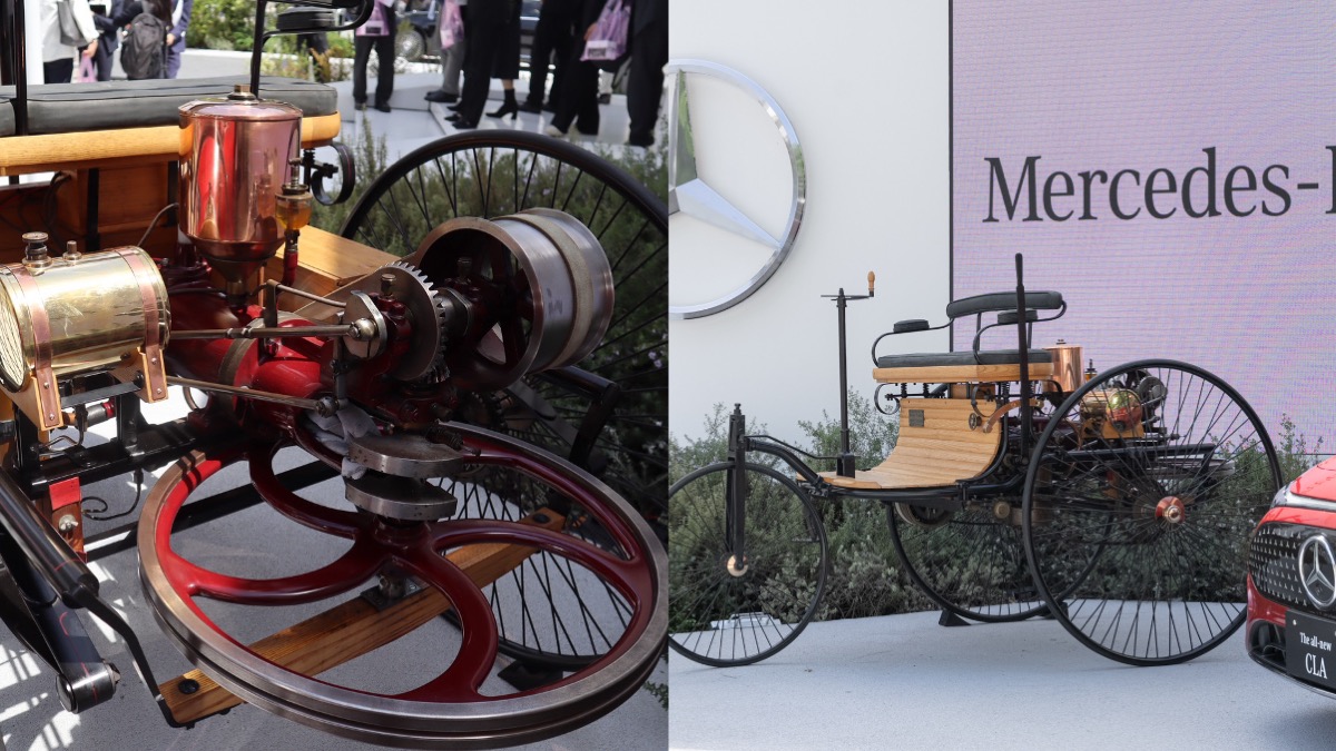 カール・ベンツが作った世界初の実用的なガソリンエンジン自動車「パーテント・モートルヴァーゲン」のレプリカの展示(写真上)や、映画『プラダを着た悪魔2』内でミランダ・プリーストリーが使用するモデルMaybach S-Classと世界観を表現した華やかなディスプレイ(写真下)などの時代を超えたラインナップが並ぶ。
