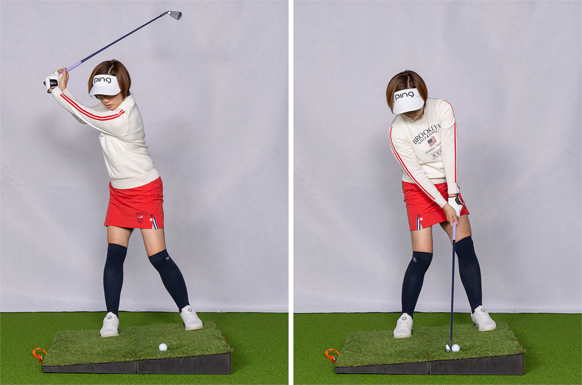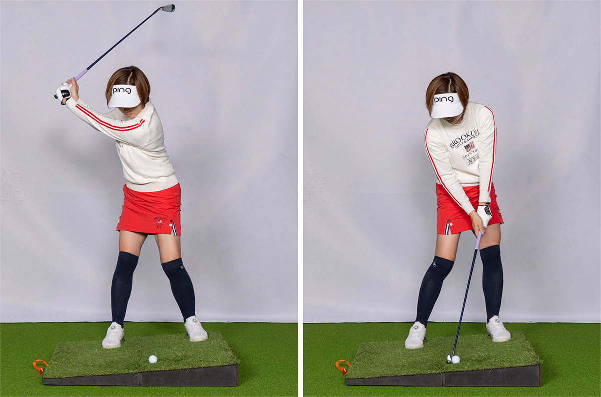 ただし、注意していただきたい点があります。斜面にブツけて打つ場合、ボールに対して真っすぐヘッドを入れると、手前に入ってザックリしたり、フェースの上に当たってテンプラになることがあります。なので同じブツけるにしても、フックボールを打つイメージでインサイドアウトに振り、ロフトを立てるように打ちましょう。
