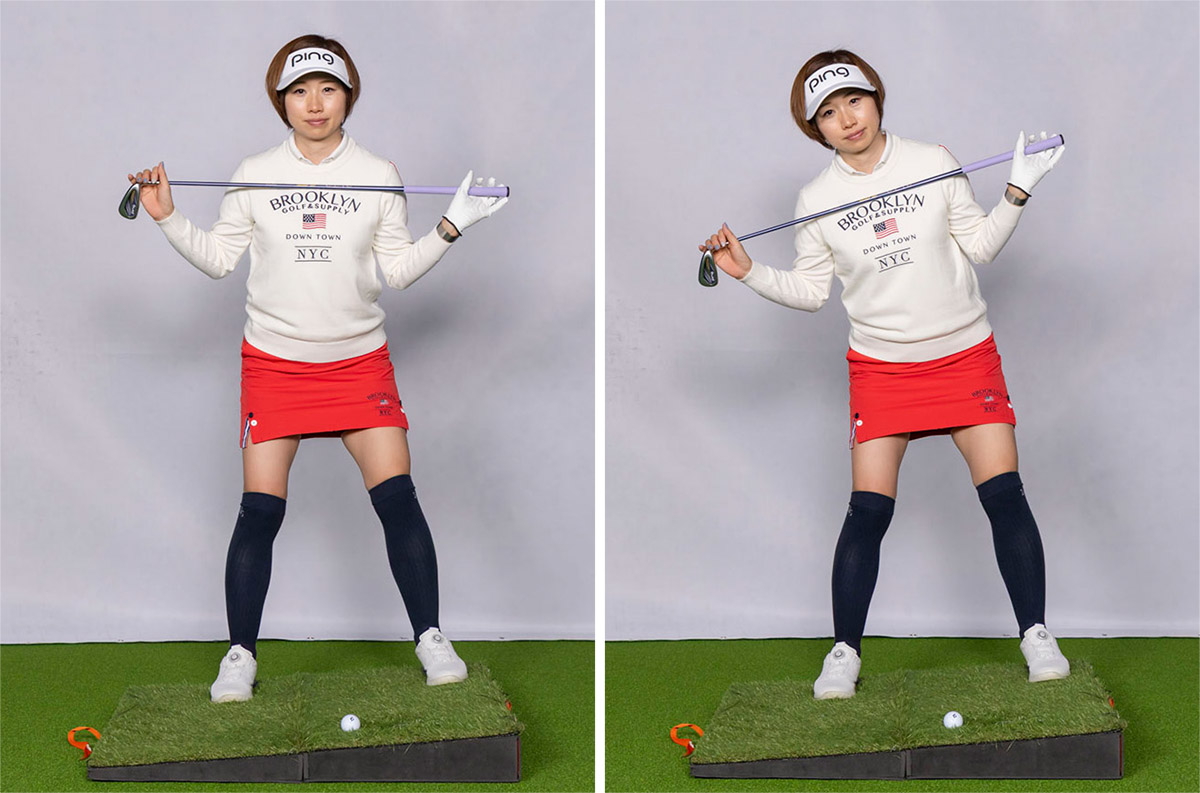 一番簡単なのは セットアップで肩をやや右に向けておくこと。スタンスラインはスクエアで、肩のラインだけちょっとクローズにし、肩が向いた方に向かって振るのです。クローズスタンスにしても悪くはありませんが、傾斜によってはクラブをインサイドから入れづらくなるので、そこは状況次第。振りづらくならないこと優先してセットアップしてください。これだけ知っておけば本当に実用的なショットになります。