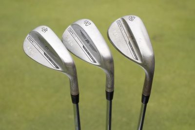 46度と52度は、フルショットやフェースをスクエアにして打ちやすい「F」グラインド(ソールを削っているようにも見えるが)、58度はソールの後方を大胆に落としたローバウンスの「T」グラインドをセレクトした。