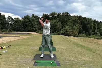 「40ヤード以上で足をそろえていたら、腕を振り回すことに。これではミスが増えます。右足カカトが上がらないのが、足を使えていない証拠です」(松吉)