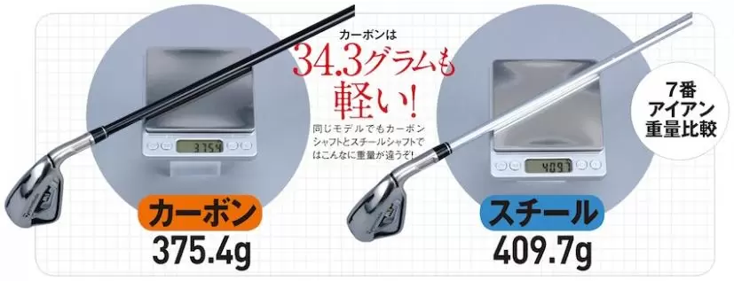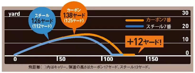 カーボンの打点(オレンジ)はフェースセンターから3ミリトゥ側、スチール(水色)だと11ミリもヒール側にずれている。改善されたスイングに伴って、インパクト(打点)も大きく改善されたのだ。