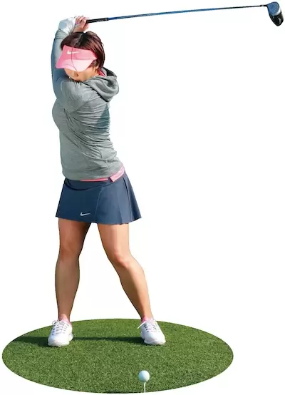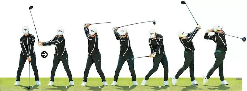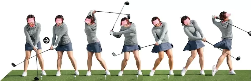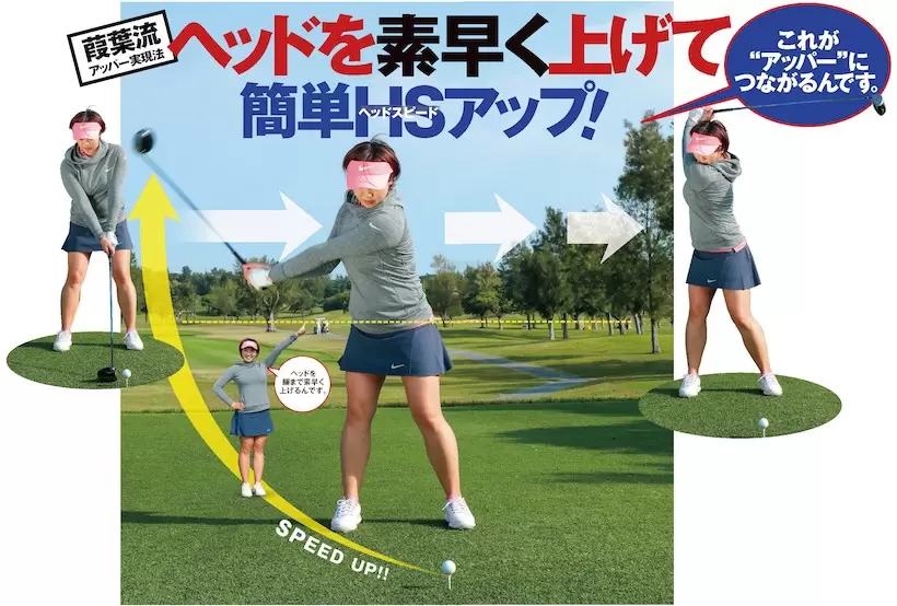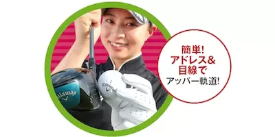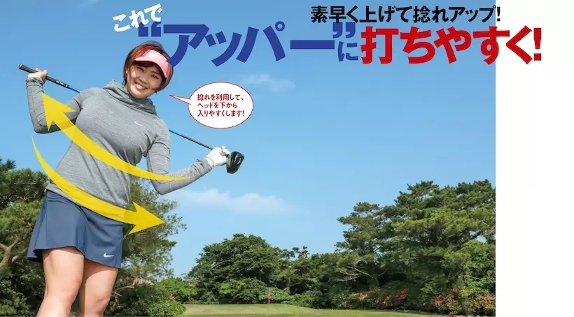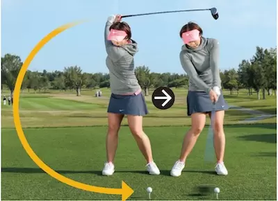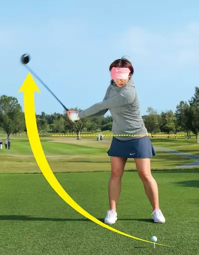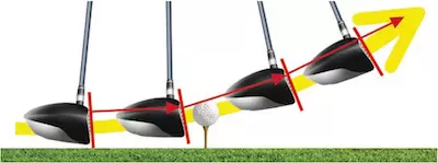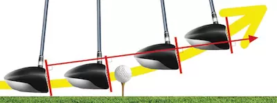 上記イラストのように、黄色い線のヘッド軌道はインパクトからフォローに向けて徐々に上がっていくが、インパクト手前からフォローまでロフト角が変わらない。このイメージを持つことが大切。