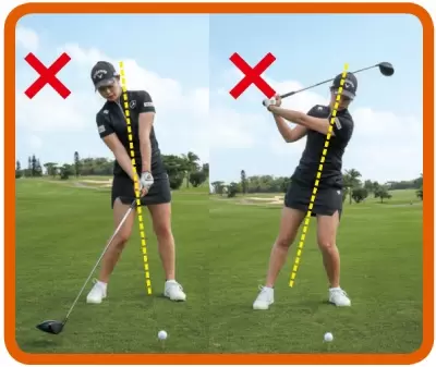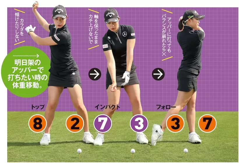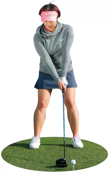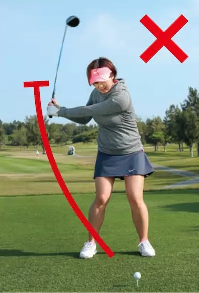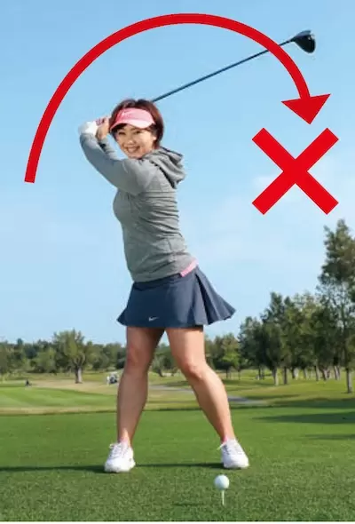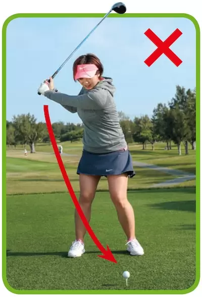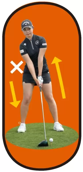 アマチュアはフェースを開いてアッパーに打つので、ヘッド軌道と一緒にロフト角も上向きになっていく。これだとフェースが開いてインパクトしてしまうので、右に行きやすくなる。