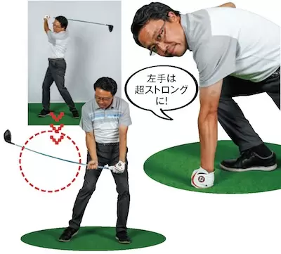 左手は地面を強く押したときのナックル部分の見え方と同じくらいのストロンググリップでOK!(写真右)