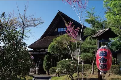 趣の食事処「田舎家」は茅葺屋根の古民家。