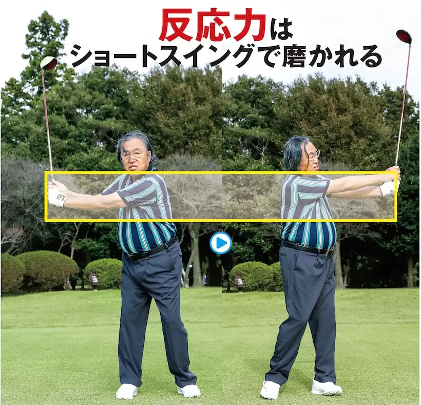 左腕が地面と平行になるトップから、右腕が地面と平行になるフィニッシュまでフルパワーで叩くのがショートスイング。この中に、スイングの基本的な動作がすべて入っている。初心者がスイングを覚えるだけでなく、ベテランが反応力を磨くための練習としても最適だ。