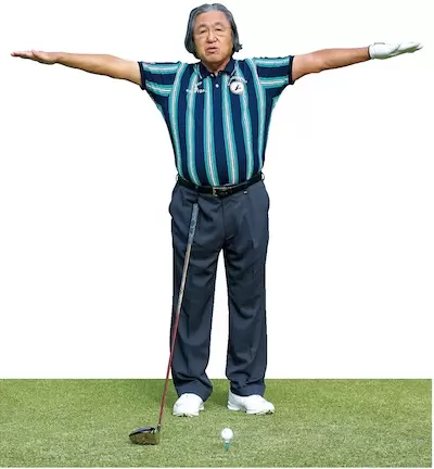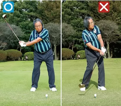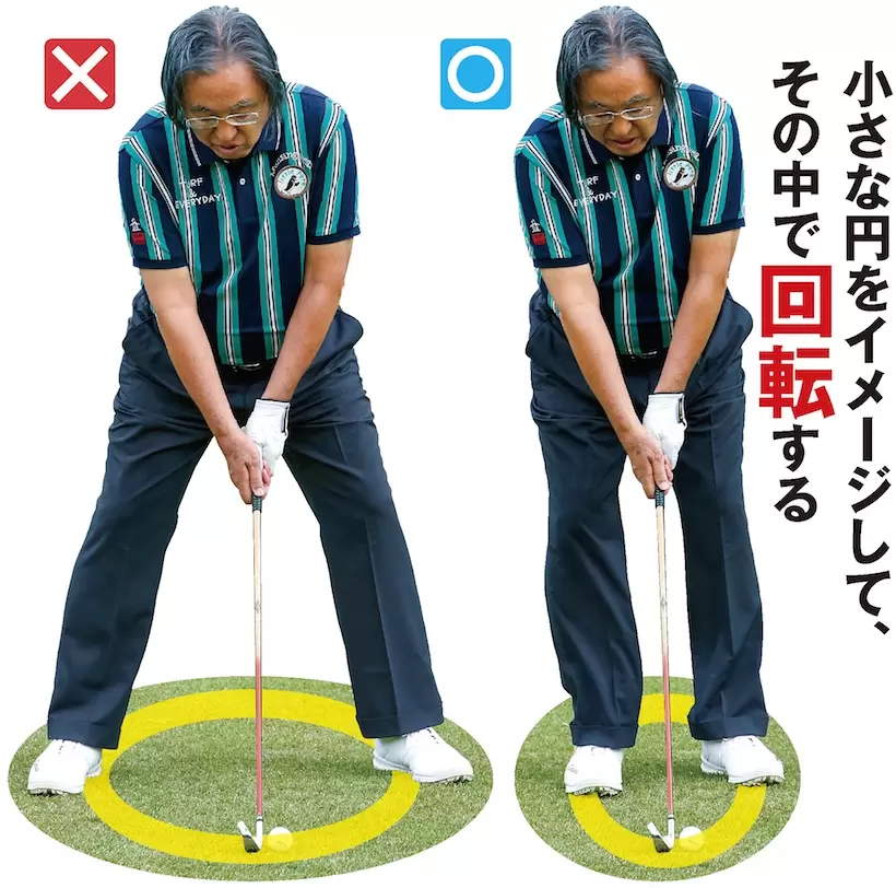 スタンスを狭くして、小さな円の中で回転すれば、体重移動が起きないのでスエーしにくくなる(写真右)。広いスタンスで円が大きくなるほど体重移動が大きくなる。飛距離は出るがミート率が下がる(写真左)。