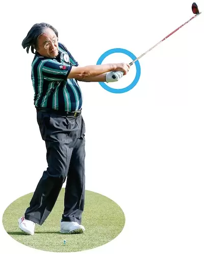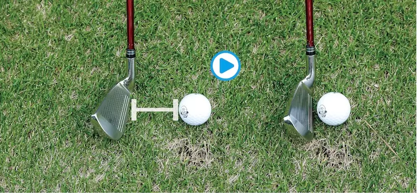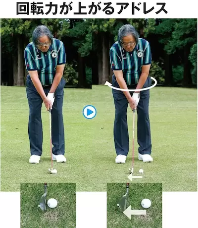 年齢とともに球がつかまらなくなってきた人は、ボールの手前約2㎝くらいのところでわざとダフらせてみよう。芝の抵抗でフェースが返って、スクエアにインパクトできる。