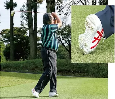 フィニッシュで足の甲を返さないように意識すれば、背中の筋肉が使えるようになる(写真右)。