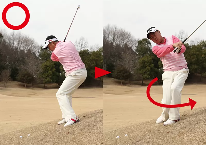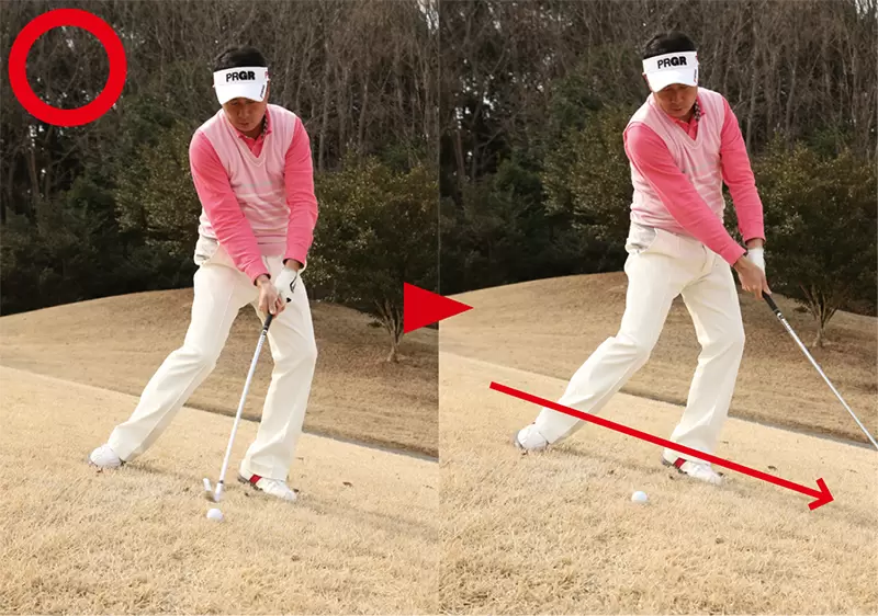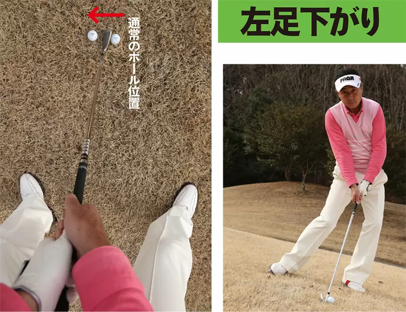 左足のほうが低いため、インパクト時も左足に体重がかかる。そのため、インパクト位置は通常よりも左寄りに。これに合わせてボール位置を左足寄りに置くのが正解!