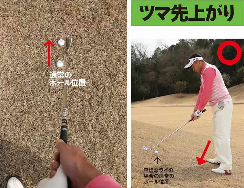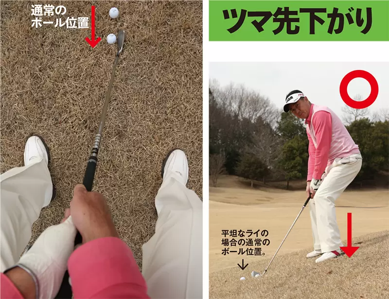 ツマ先上がりの傾斜で後ろに体重がかかるとボールに届かないため、ツマ先に多く体重を乗せて構えることが必要。結果、いつもよりヘッドと足元が離れた状態になるため、あらかじめボールを少し遠くに置くのが◎!