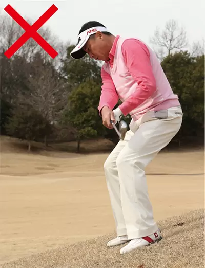 ツマ先下がりでは下半身を安定させるためカカト体重で構え、そのカカト体重をキープしてインパクトするのがポイント。カカトに乗ると少しボールから離れる形になるので、そのぶんボールに近づいて構えることが大事。