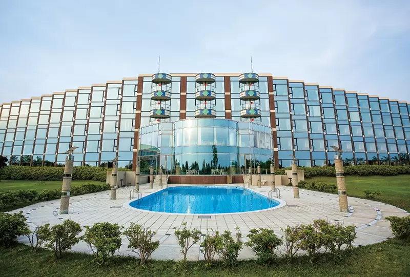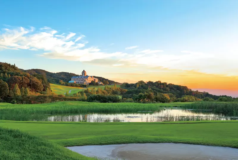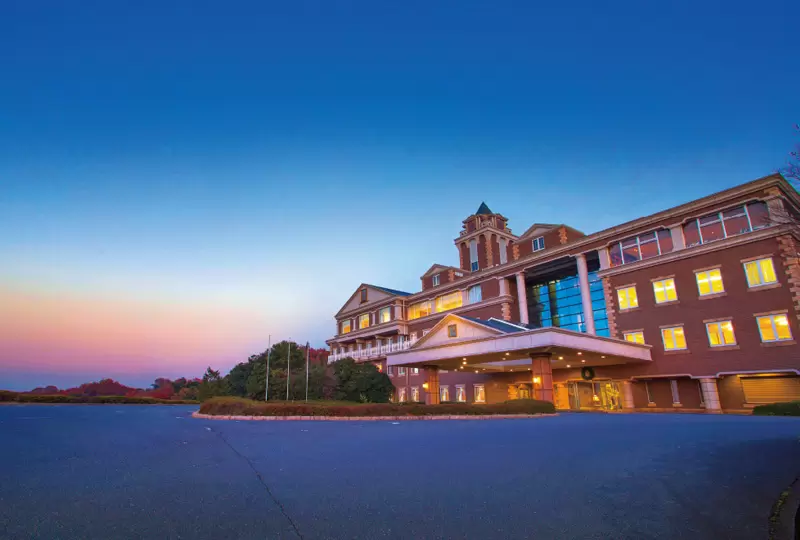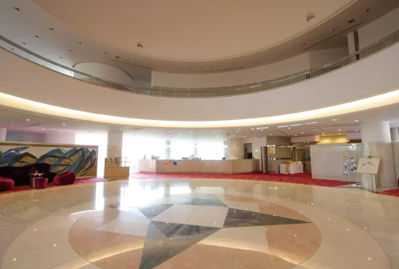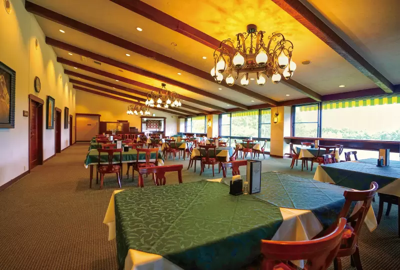 花飾り、ステンドグラスが迎えてくれるクラブハウス。