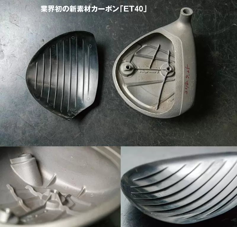 クラウン裏側のカーボンリブは、フェースと平行になっていることで、インパクトでは反発性能を落とさずに、上側からの荷重に強い形状になっている。フェース裏側の牙状のリブは、ボールの打点となるセンター部分に装着。