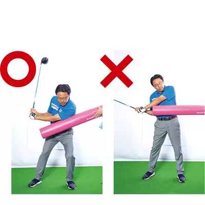 ヒジの向きが地面やボールを向くのが正解。ヒジがインパクト前から目標を向くのはNG。