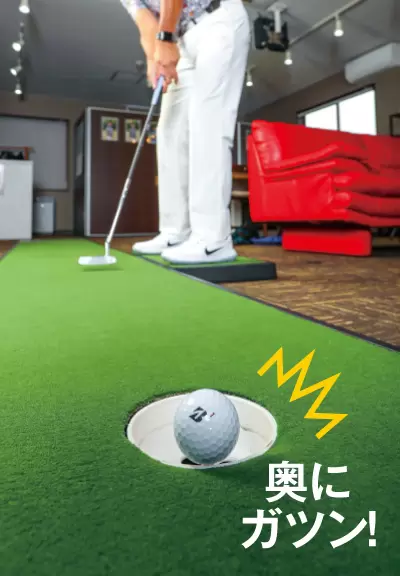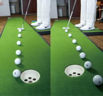 (右)外し続けるのは意外と難しい。ショートパットから徐々に距離を伸ばしてトライ。 (左)カップの右に外し続ける。カップインしてしまう人はヒッカケるクセがあるかも。