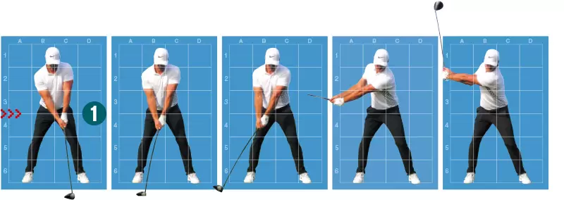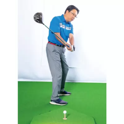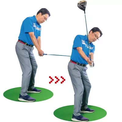 テークバックを体で始動しながら、シャフトを立てるイメージでクラブを動かせばタテ軌道になる。
