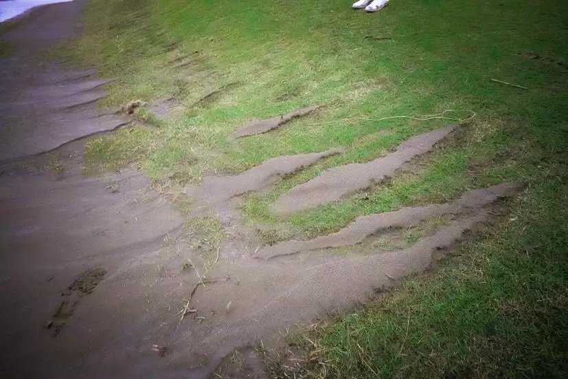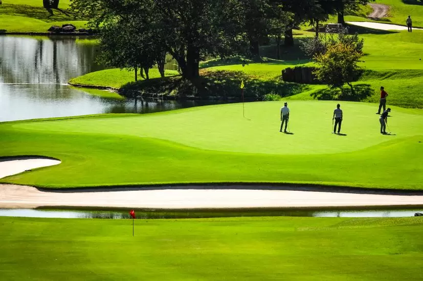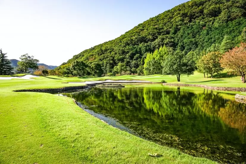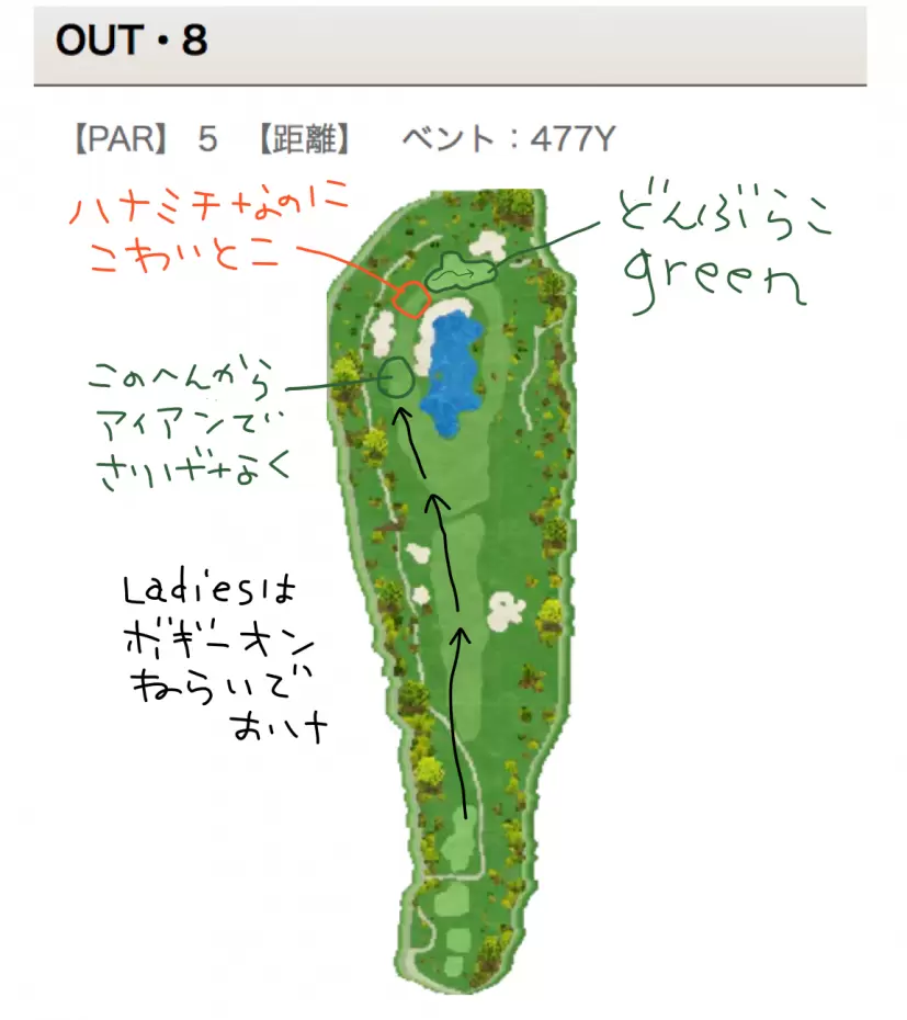1番ホール。冠水して図らずも池越えPAR3の佇まい