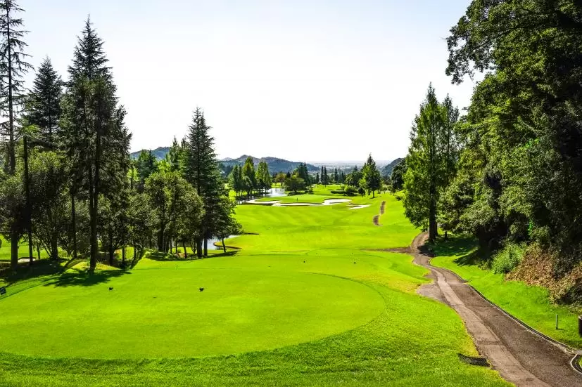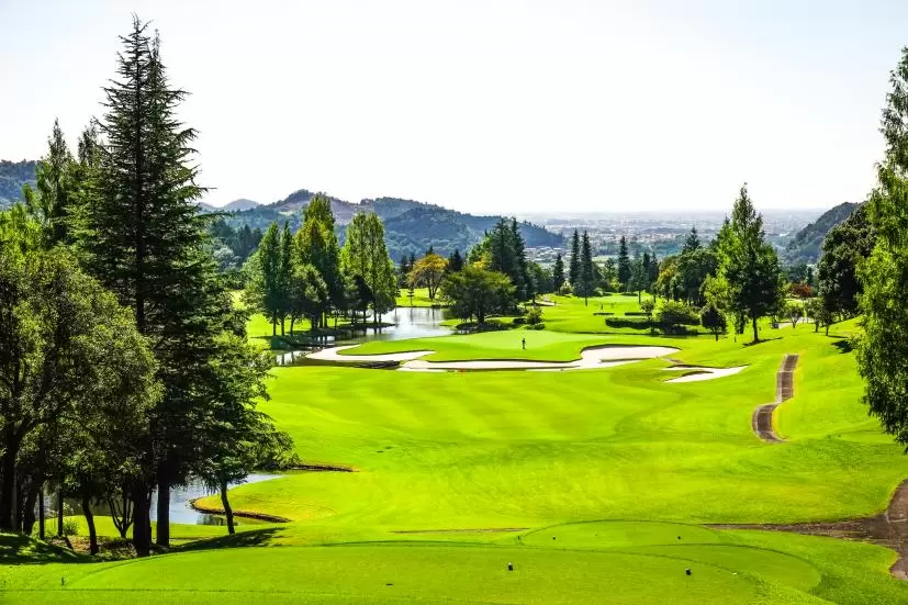 10番PAR4、フルバックの丘からクラブハウスを振り返って見つけた18番グリーンとフェアウェイ
