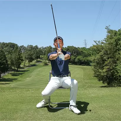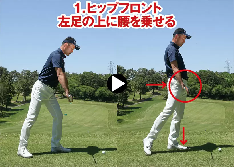 両手でクラブを水平に持ち、右足を後ろに引いた体勢から腰を左足の上に素早く乗せる。左ヒザを伸ばすのがポイント