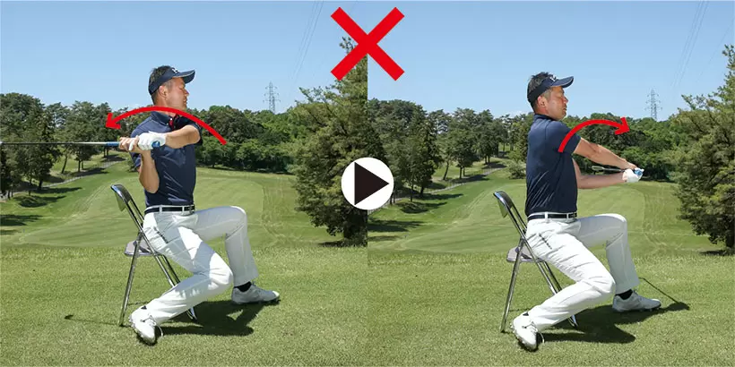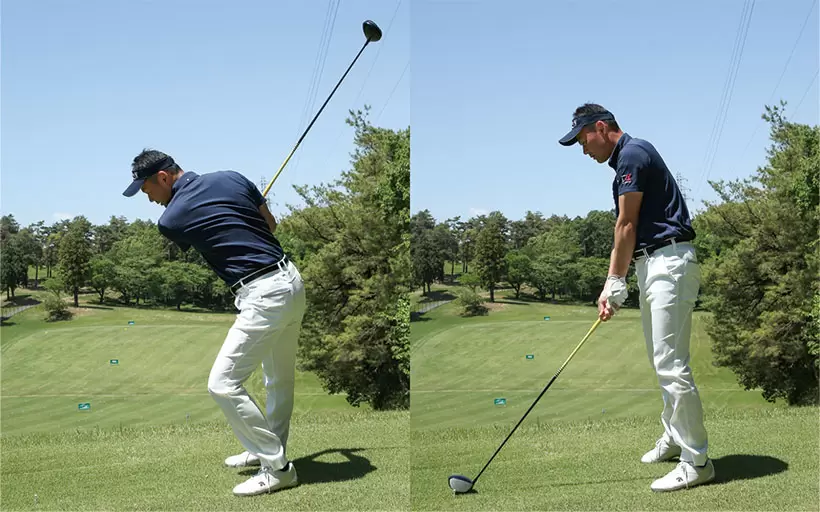 バックスイングで胸を開いて背中を縮める(左)。ダウンスイングでは胸を縮めて背中を伸ばそう(右)。