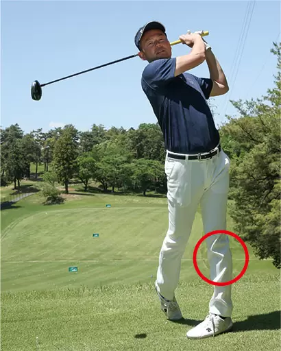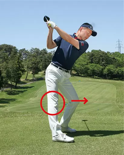 バックスイングからトップにかけては左ヒザが前に出て、右ヒザを伸ばしていく。