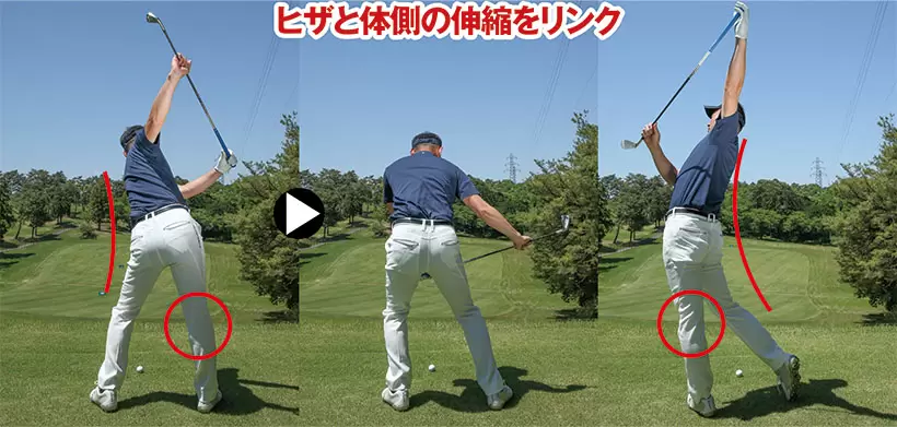 バックスイングでは左の体側が縮み、右ヒザが伸びる。ダウンスイング以降は右の体側が縮んで左ヒザが伸びる。