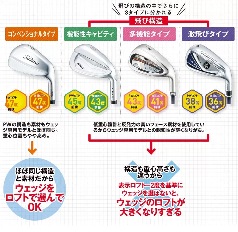 構造も重心高さも違うから表示ロフト-2度を基準にウェッジを選ばないと、ウェッジのロフトが大きくなりすぎる