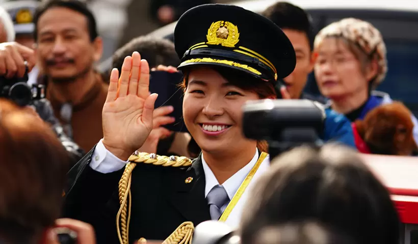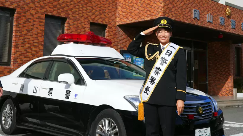 式典用の礼服に身を包んで笑顔で敬礼する渋野日向子。