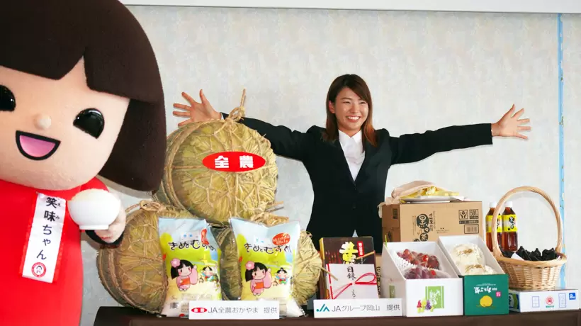 JAグループ岡山の青江会長から「岡山米」などの岡山県産農産物の贈呈を受ける渋野日向子。