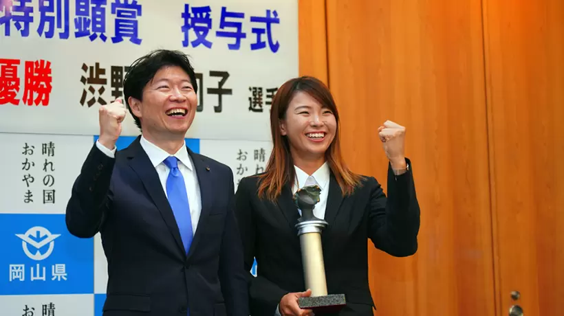 スーツに着替えて「岡山市人見絹枝スポーツ顕彰表彰式」に出席した渋野日向子。