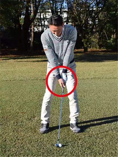 ボールの位置はスタンス中央付近。両手を左モモのツケネの前にセットし、軽くハンドファーストに構える。