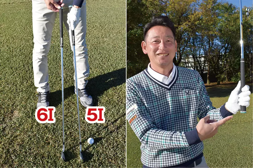 5番アイアンで打つときはグリップエンドを余らせて6番アイアンと同じ長さに持とう。