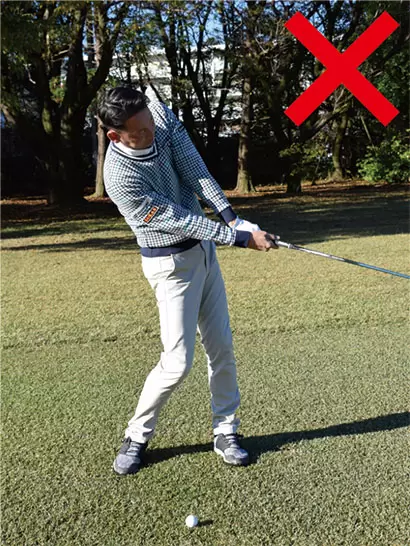 上げようとするとインパクトが右足体重になり、ロフト角が増えて飛距離が落ちる。
