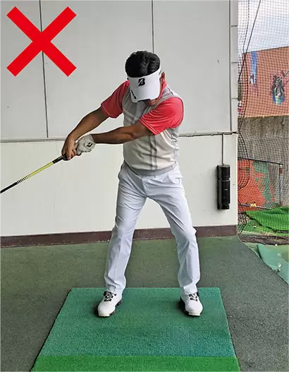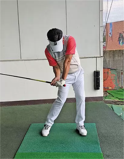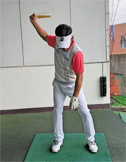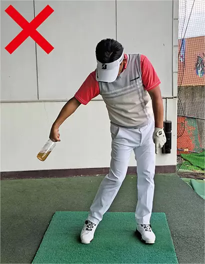手首の角度を保って、ペットボトルを立てて液体を手元側にキープしたままダウンスイング