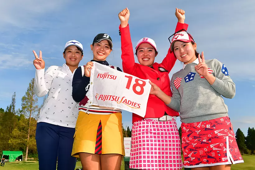 古江の優勝を喜ぶプラチナ世代の仲間たち。右端は西村優菜、古江の左が吉田優利。