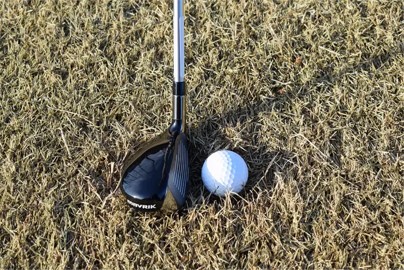 ボールはディボット跡の中。こんなときは7番アイアン以下のクラブもいいが、ユーティリティクラブがより確実といえる