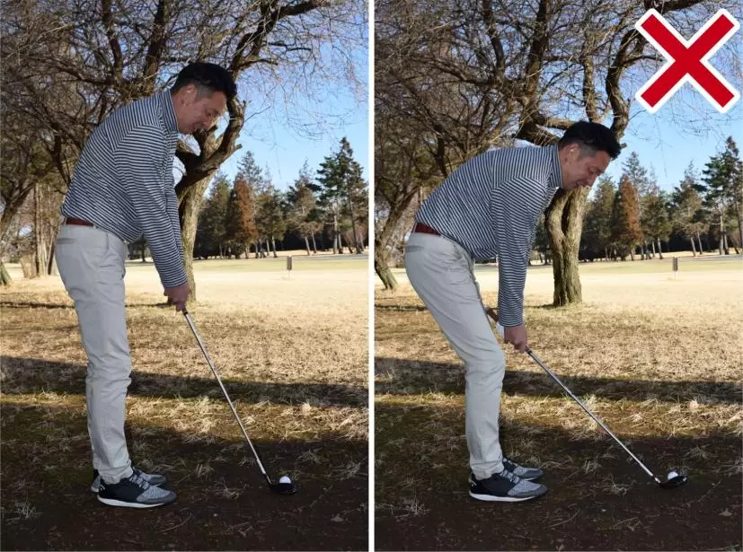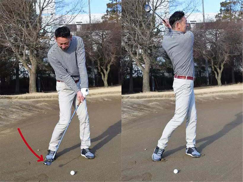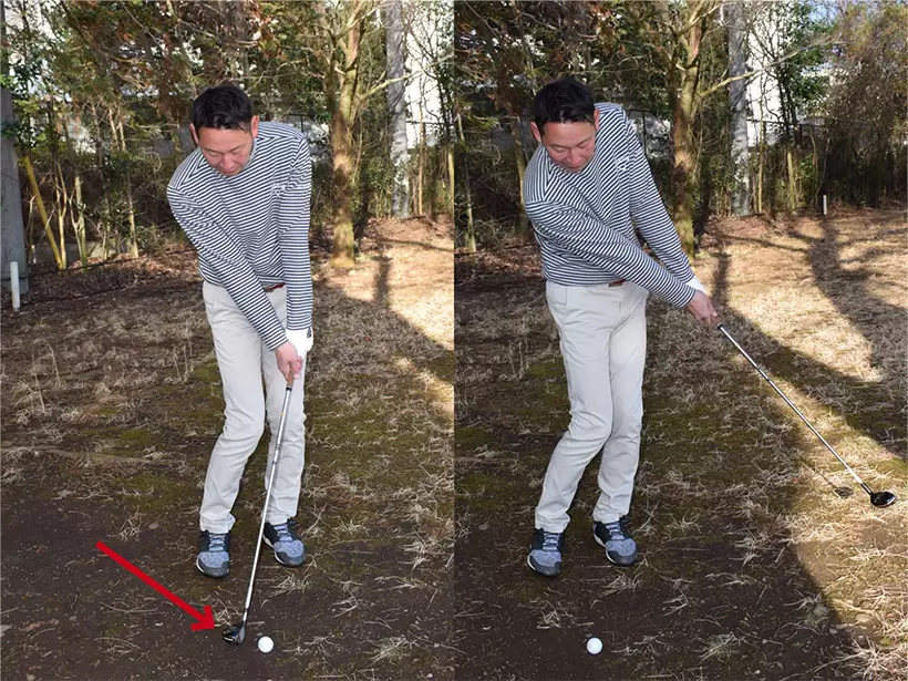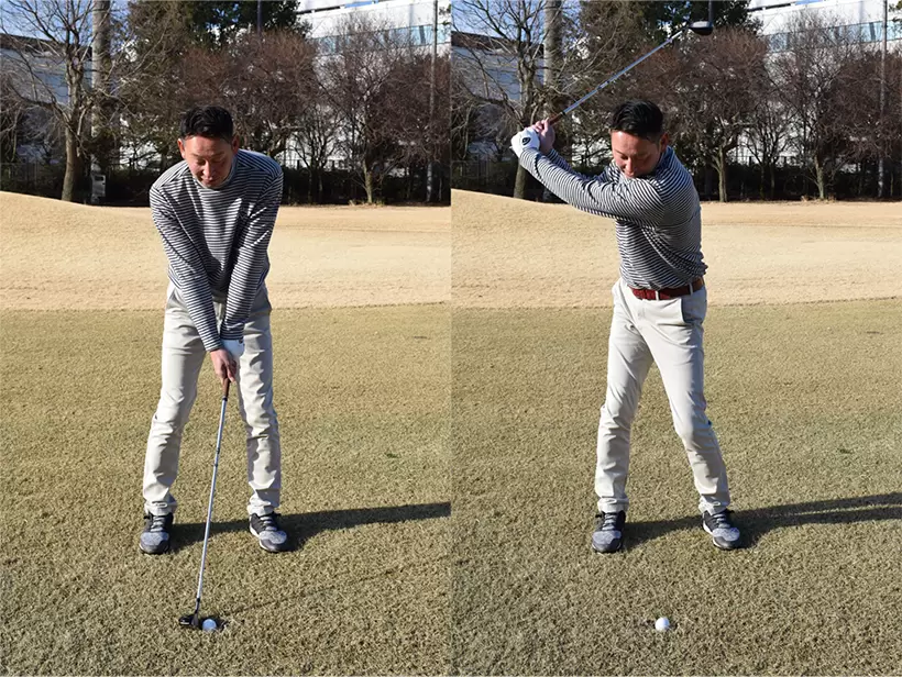 ボールを通常よりも半個から1個内側に置く。バックスイングでは上体をしっかり捻転しよう