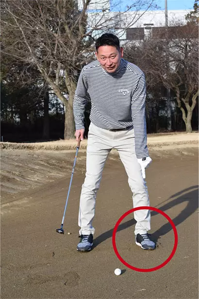 通常のスタンスから左足を少し深く埋める。足場が安定しやすく、上からヒットしやすいメリットがある