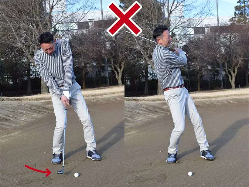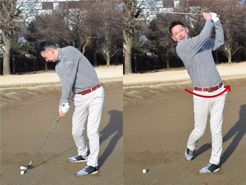 距離を出そうとして振り回すのはNGだが、腰の回転を使って振り抜くことが大切なポイントだ