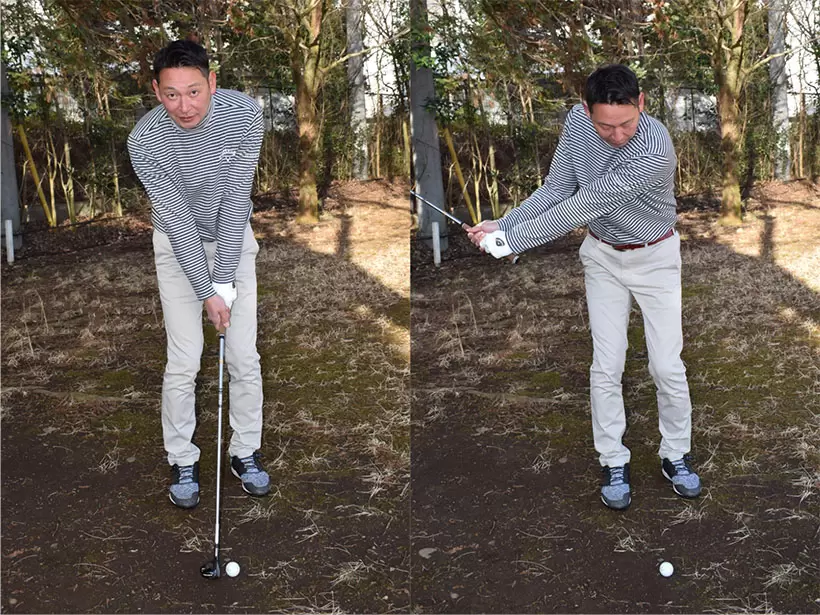 ボールをスタンス中央付近にセットし、手首を固定してテークバックする