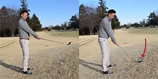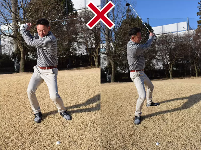 スイング中に両ヒザが流れると、最後までバランスよく立てない