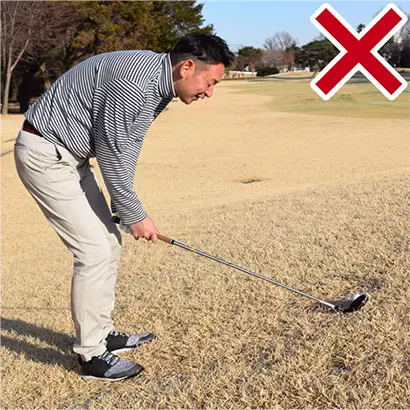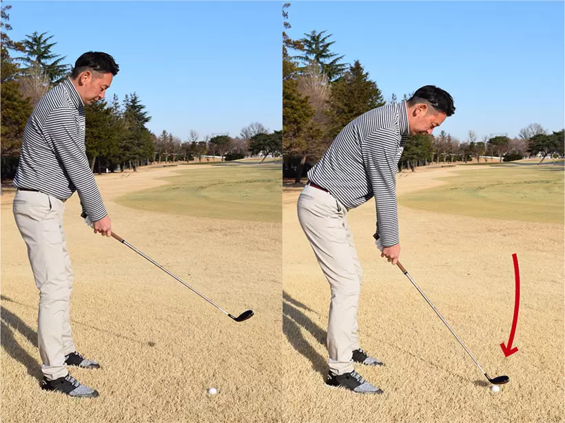 直立の姿勢からクラブヘッドがボールに届くまで上体を前傾させる