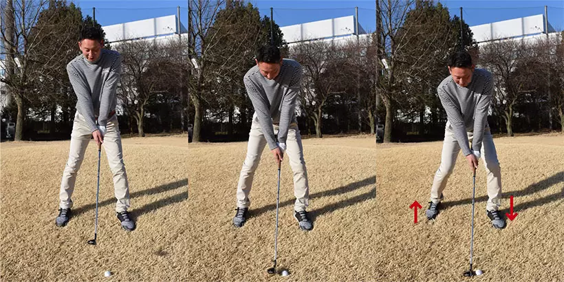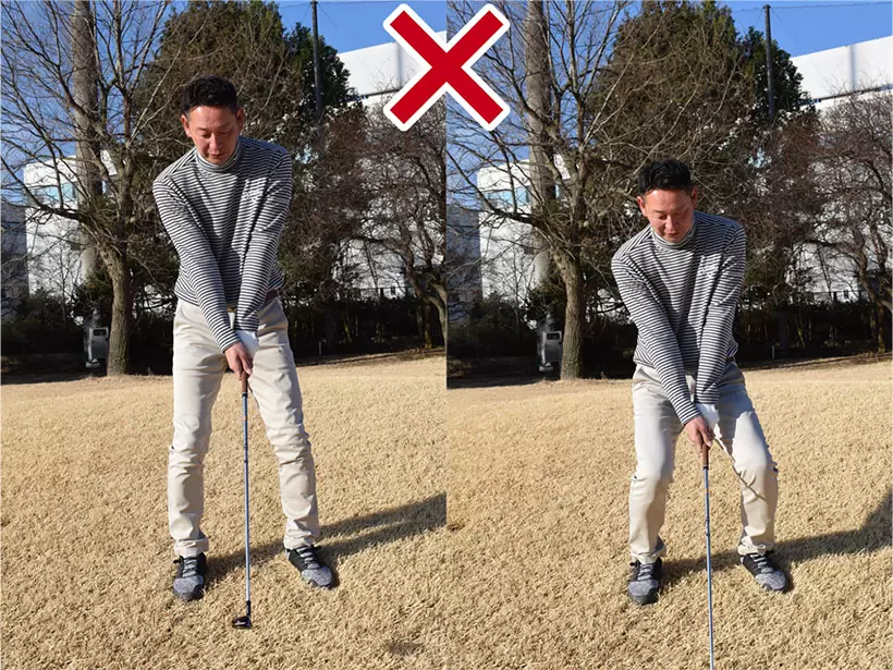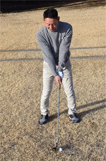 直立の姿勢からクラブヘッドが芝につくまで上体を前傾させる。やや棒立ちに構える感覚だ