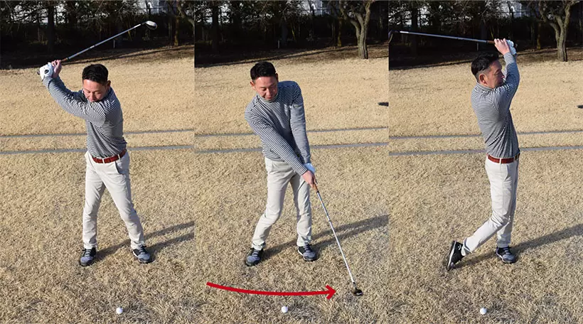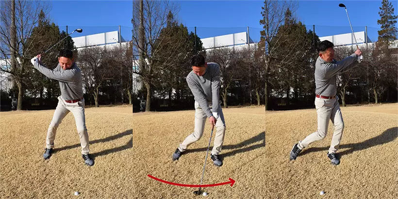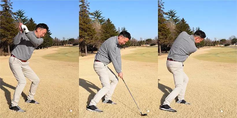 左足を軸にするイメージでスイングし、アドレスの前傾角度をキープする