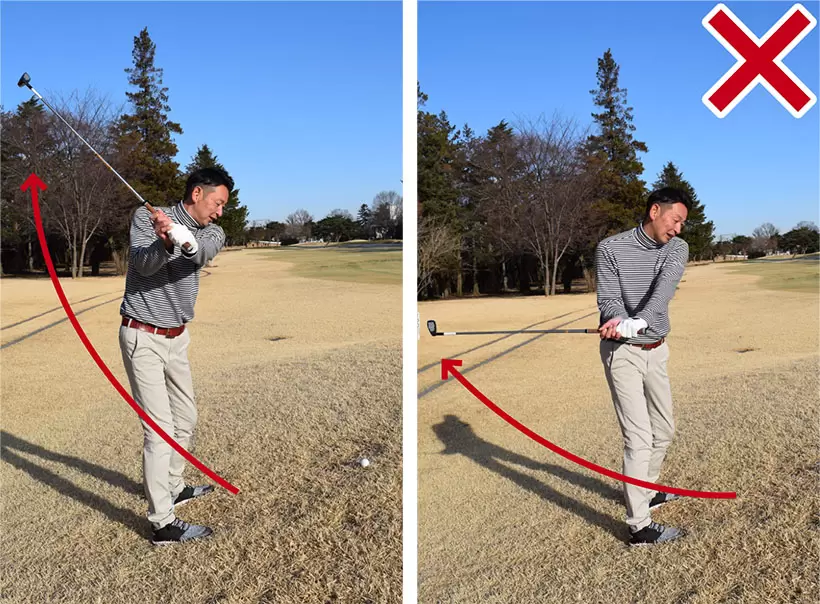 テークバックでクラブをやや立てるイメージ(左)。インサイドに低く引き過ぎないように注意しよう(右)